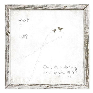 "What if I fall? Oh, but darling, what if you FLY?" is charmingly encased in a rustic, reclaimed wood frame with an antique white finish. This coastal piece complements the soft, natural hues of beachy interiors.
