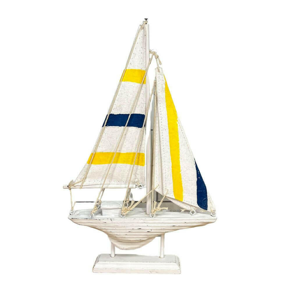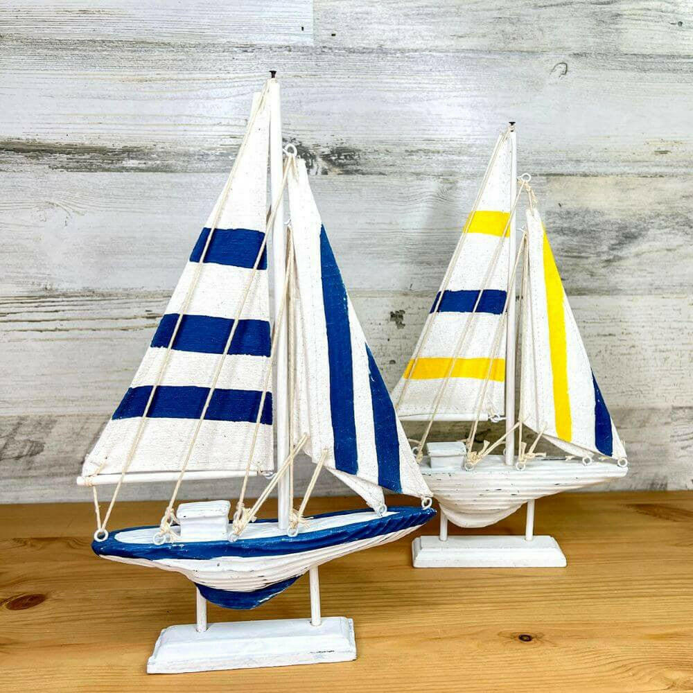 Choose from 3 color options - turquoise and white, navy blue and white, or navy blue and yellow. Mix and match with our Wooden Sailboat Schooner with Teal Sails to complete your wooden sailboat collection.