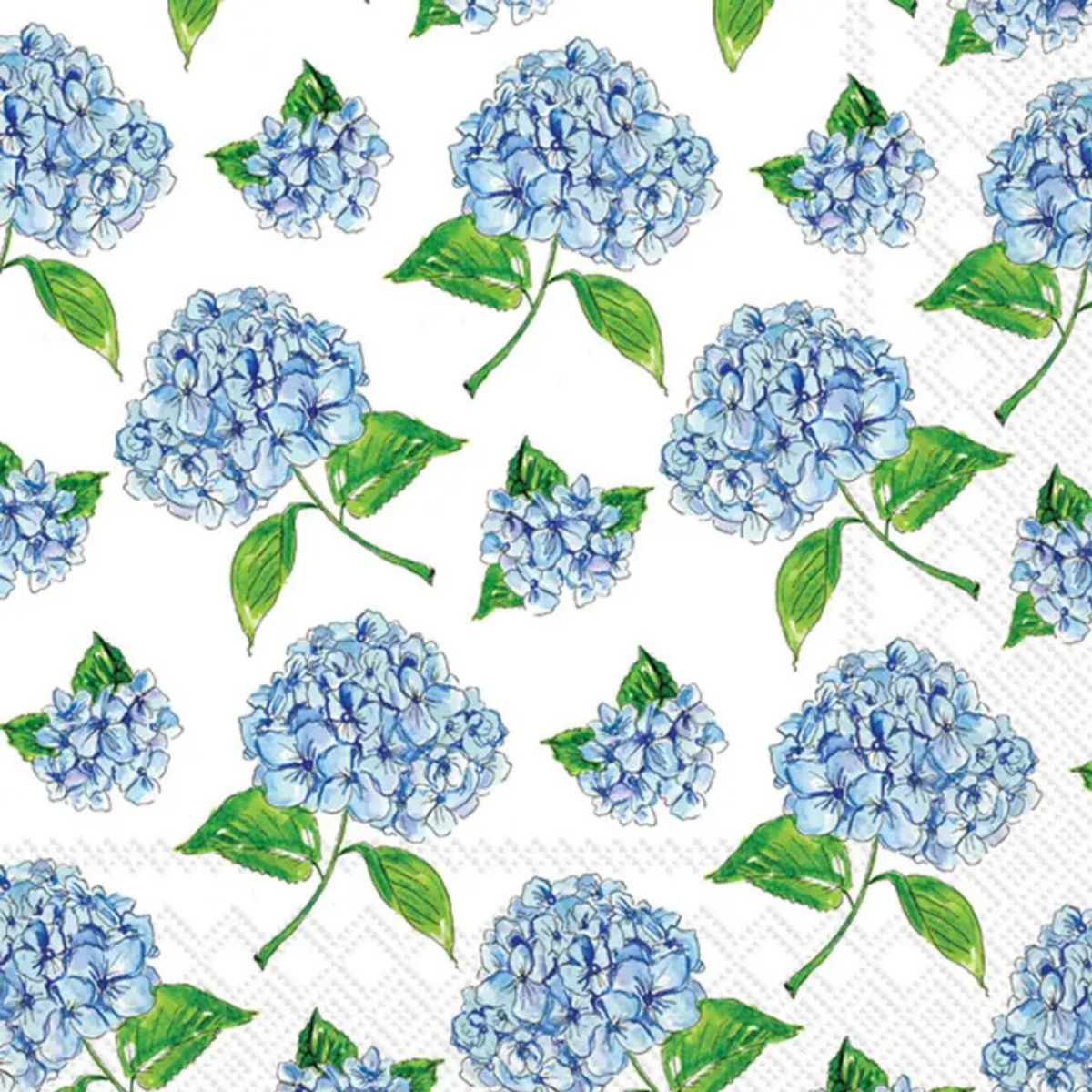 A 20-count set of 3-ply paper cocktail napkins featuring soft blue hydrangeas and green foliage.