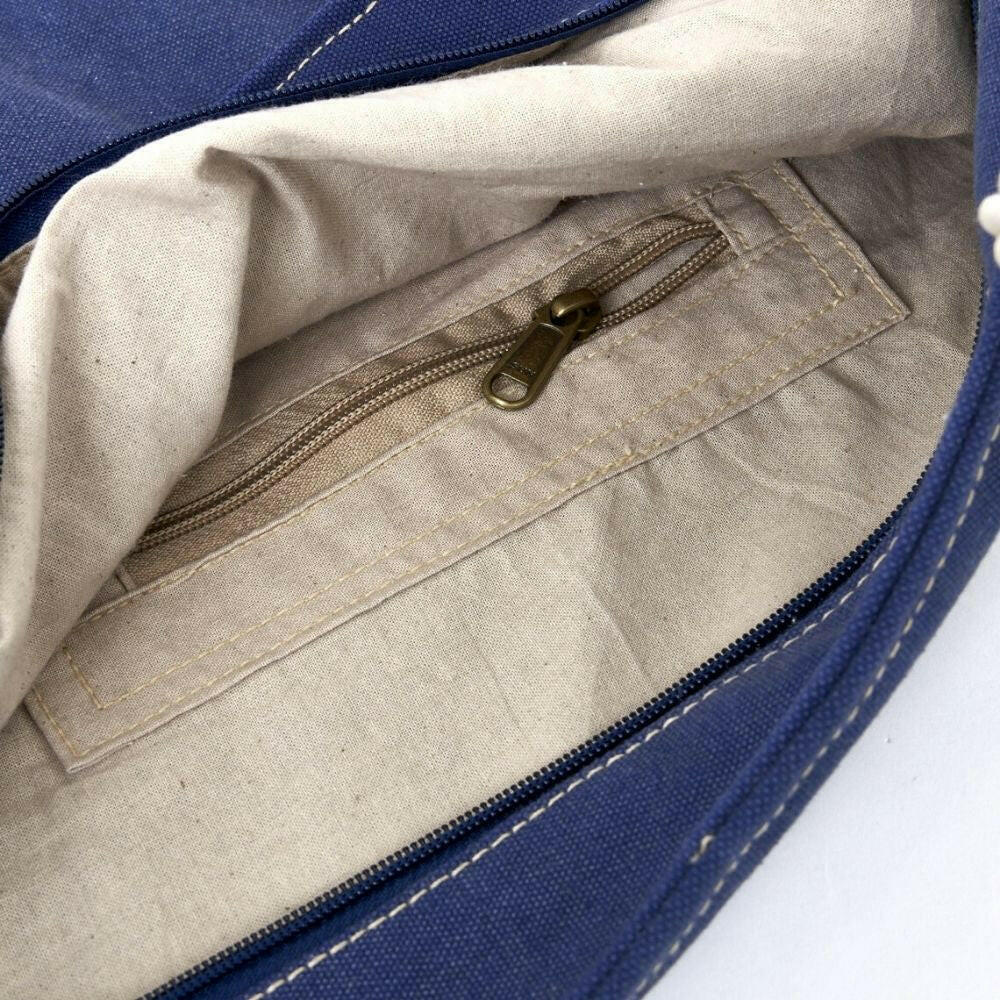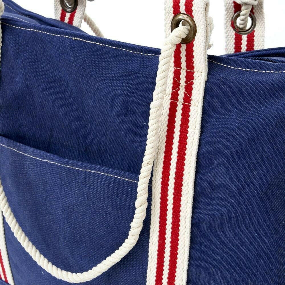 NEW! A rugged, coastal style tote perfect for hauling all your gear to the beach, boat, and beyond. The navy blue canvas with red striped trim is decidedly nautical and chic, and the grommets and leather trim add a refined touch. The natural rope handles are comfortable to carry, and the front pocket and interior zippered pocket keep your belongings safe and organized. 17" x 14". Large enough to carry everything you need throughout the day.