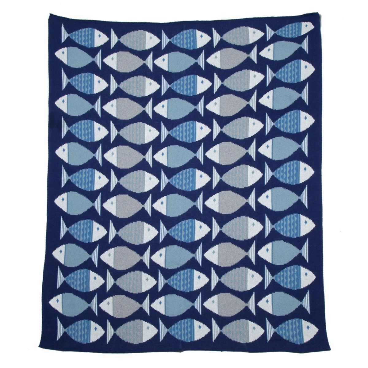 A finely knit cotton throw with a smooth hand feel and a graphic fish pattern in soft coastal tones.