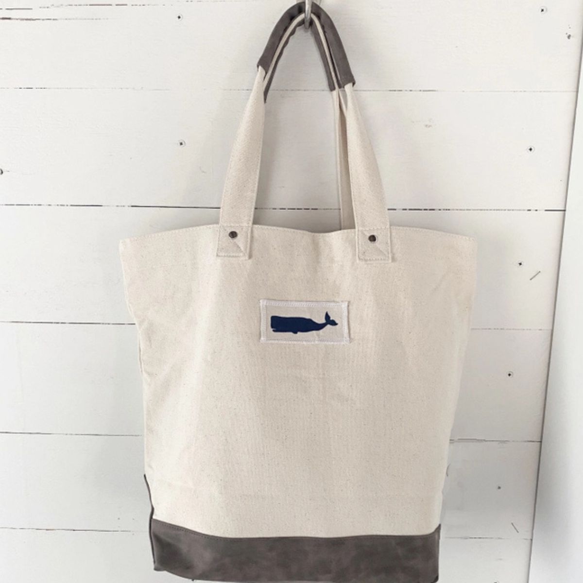 This relaxed tote brings a playful coastal accent to your everyday with a navy whale motif and natural cotton texture.