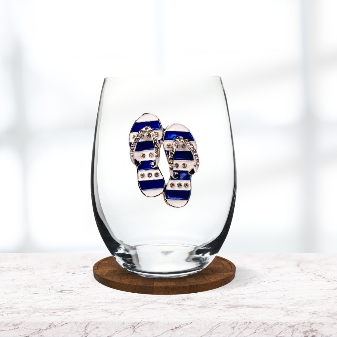 Featuring a blue and white coastal flip-flop encrusted with shimmering rhinestone jewels, this 15 oz glass captures the light beautifully adding depth and sophistication to any table setting. The invisible, extra-strong adhesion ensures that the jeweled embellishments remain securely in place.