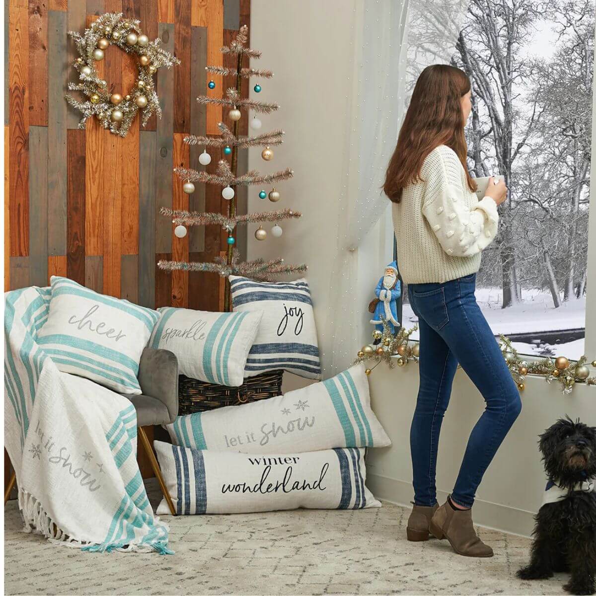 This indigo-striped cotton pillow adds an easy layer of warmth for the holidays or any time of year. The printed Joy script feels relaxed and familiar, blending effortlessly with natural textures and neutral tones.