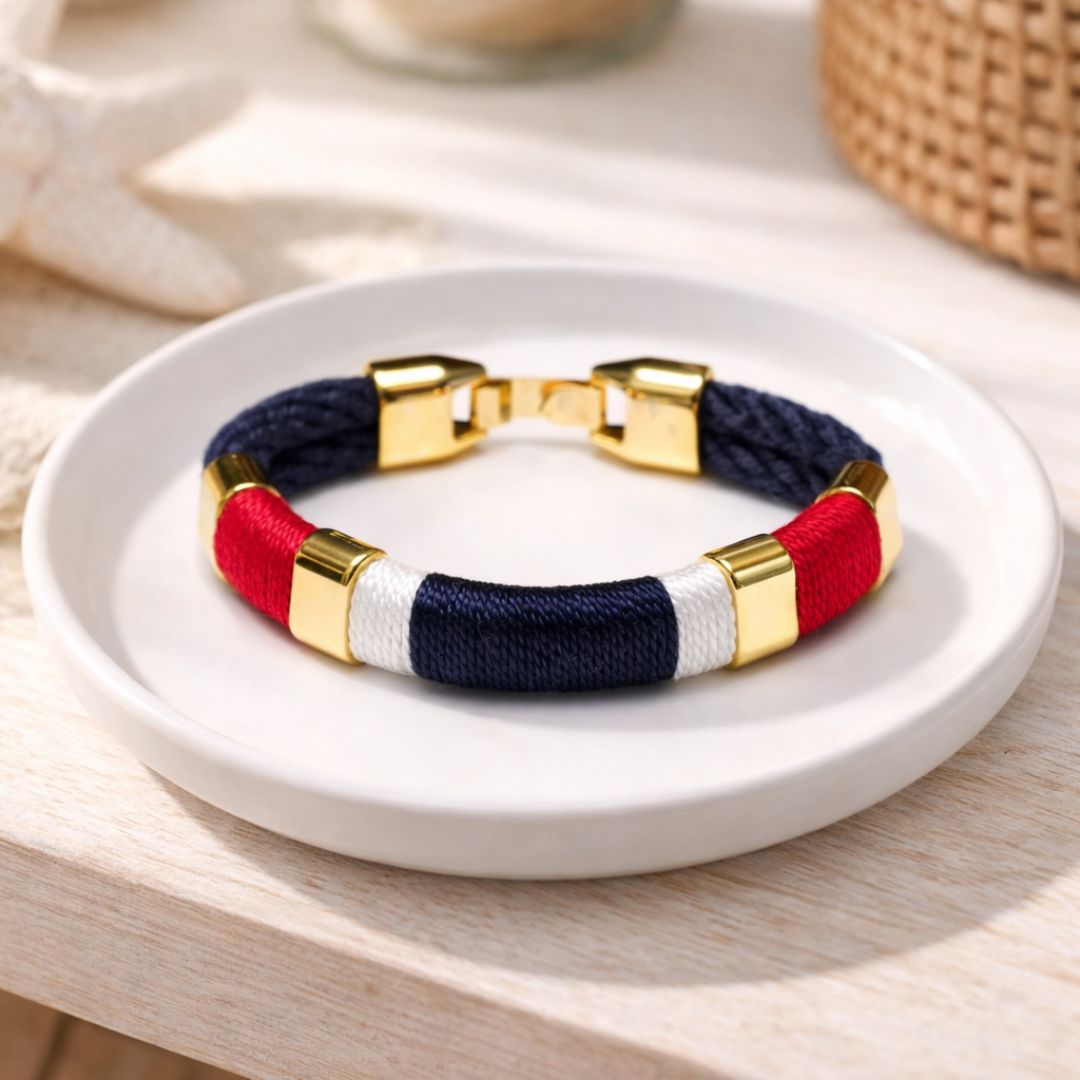 Made with hand-dyed cotton rope, this bracelet features a gold-plated clasp closure and matching spacer beads for a polished look. Inspired by coastal living and classic New England style, it’s designed with everyday wear in mind. The rope has a soft feel with enough structure to sit neatly on the wrist, whether worn alone or stacked with other bracelets.