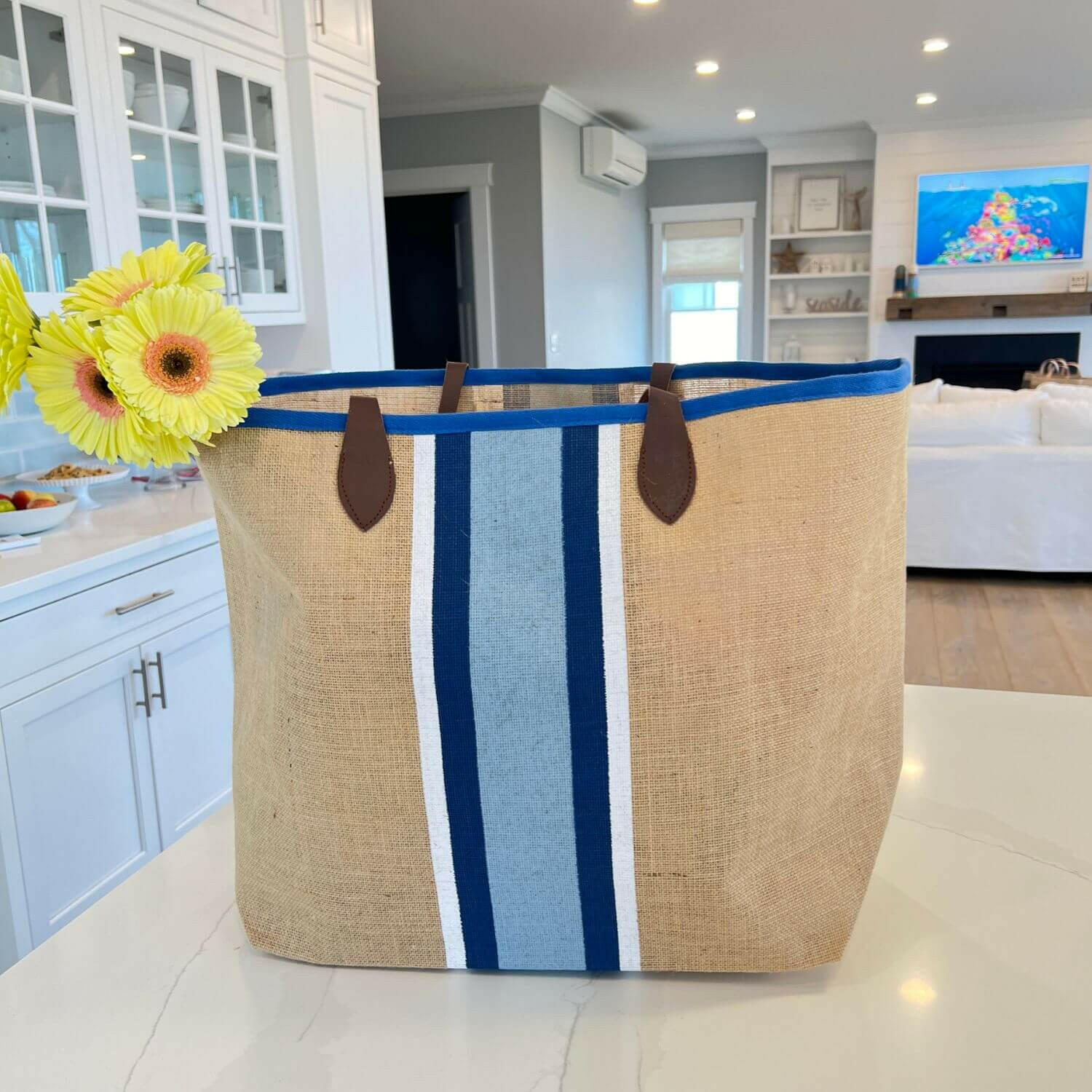 Available in blue and white stripes, this oversized tote is your go-to bag this summer. Made from high-quality laminated jute, complemented by sturdy leather handles and cotton webbing trim for a refined finish. It elevates any outfit and is great to use in so many different ways!