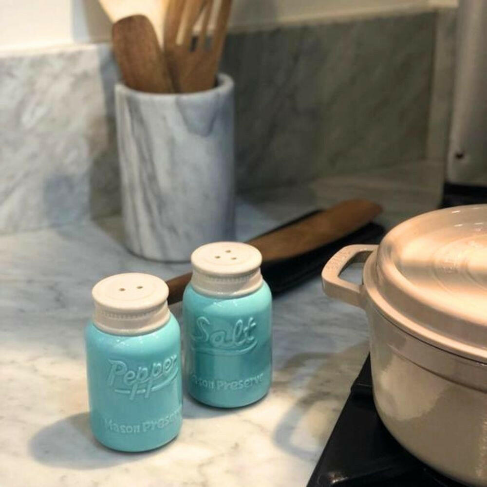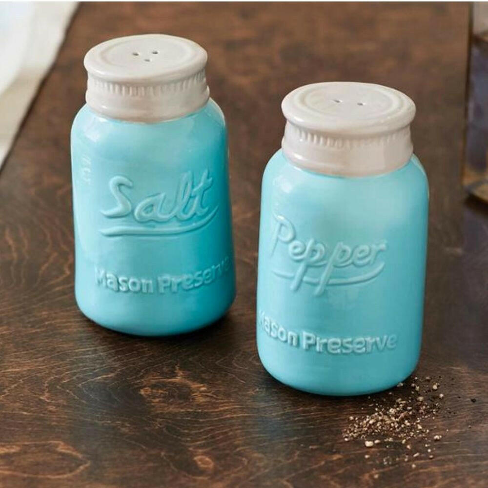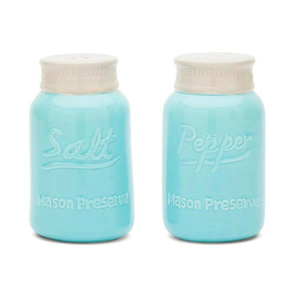 Add a touch of coastal charm to your kitchen with this Salt and Pepper Set featuring a classic mason jar design with embossed "Salt" and "Pepper" labels.