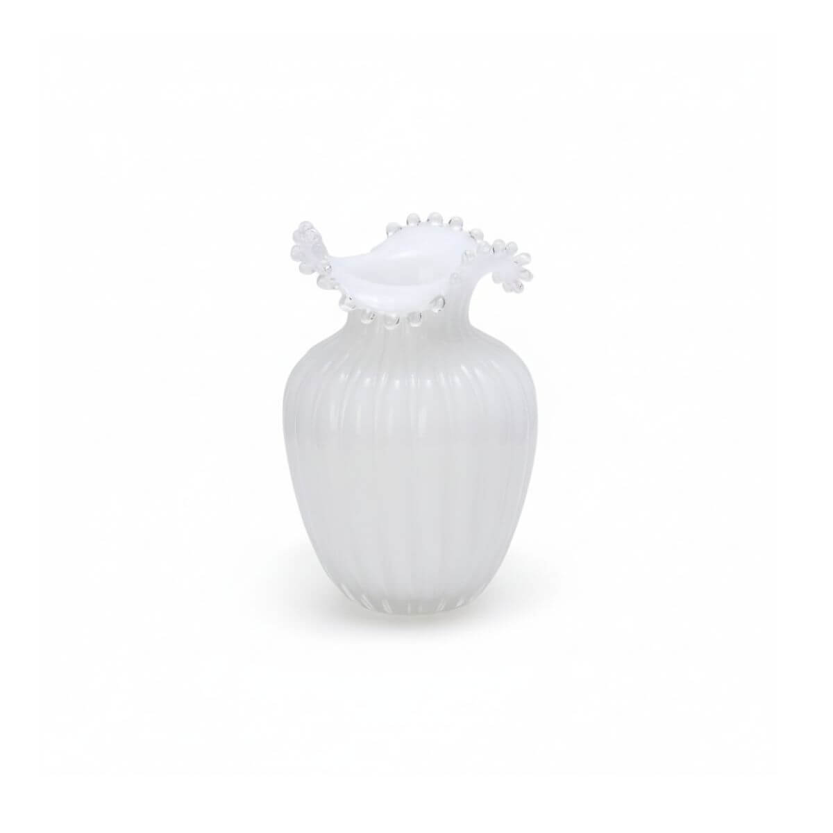 Handcrafted from high-quality white glass and finished with a delicate pearl rim, this vase adds a graceful, sculptural touch to your space. Whether styled with fresh blooms or standing alone, its soft sheen catches the light beautifully, creating a calm, coastal feel.