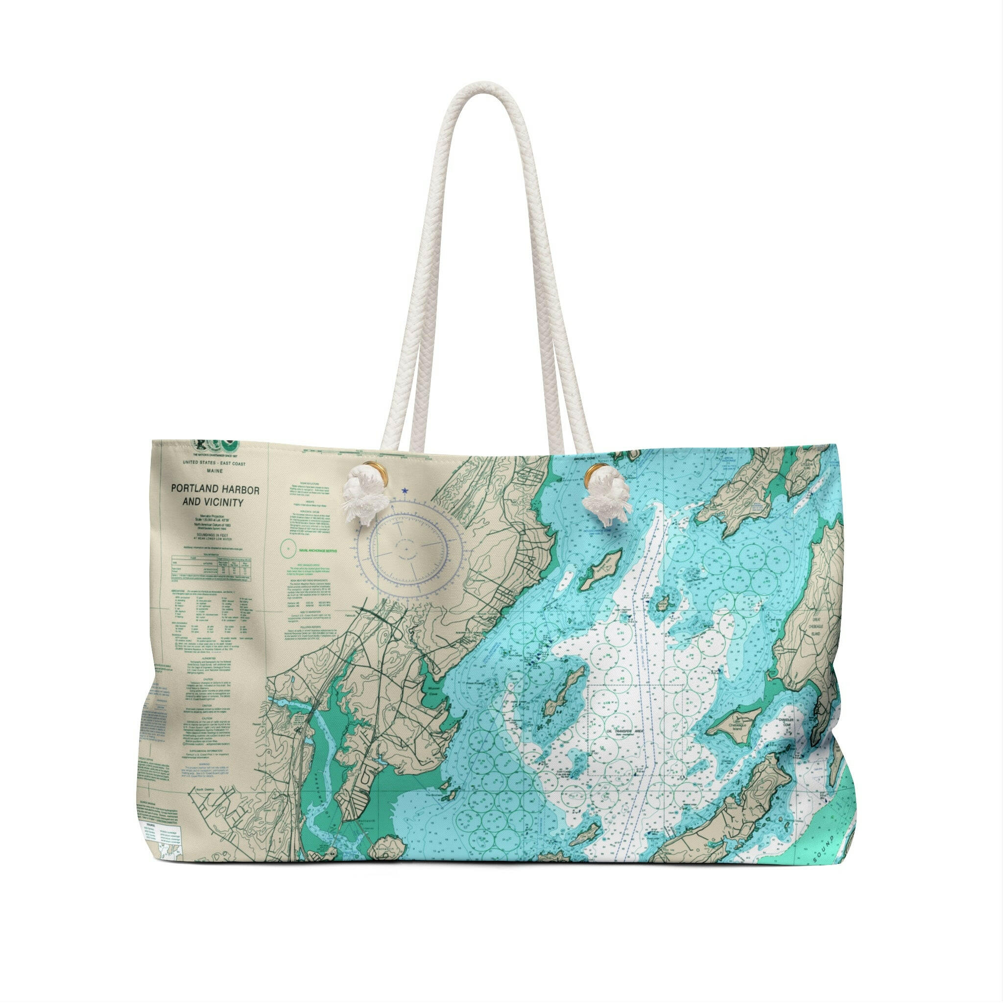 For the adventurer who loves Maine, an oversized Weekender Tote that doubles as a beach bag or airplane carry-on. At 24" wide this roomy bag holds a generous amount of personal items and is easily held by its thick nautical rope handles. Durable polyester material keeps up with the traveler. Measures 13" tall. Fully lined cream interior. 24" x 13".