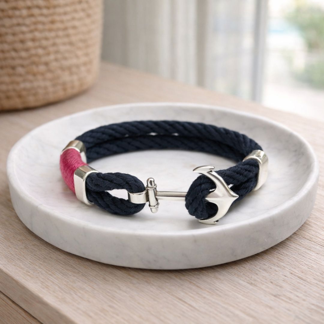 Inspired by fond memories of summers spent on the ocean, this bracelet is part of a jewelry collection rooted in classic nautical style. Made with cotton rope, it features an anchor clasp and a silver plated spacer bead for a secure, structured fit. Each piece is handmade in the USA.