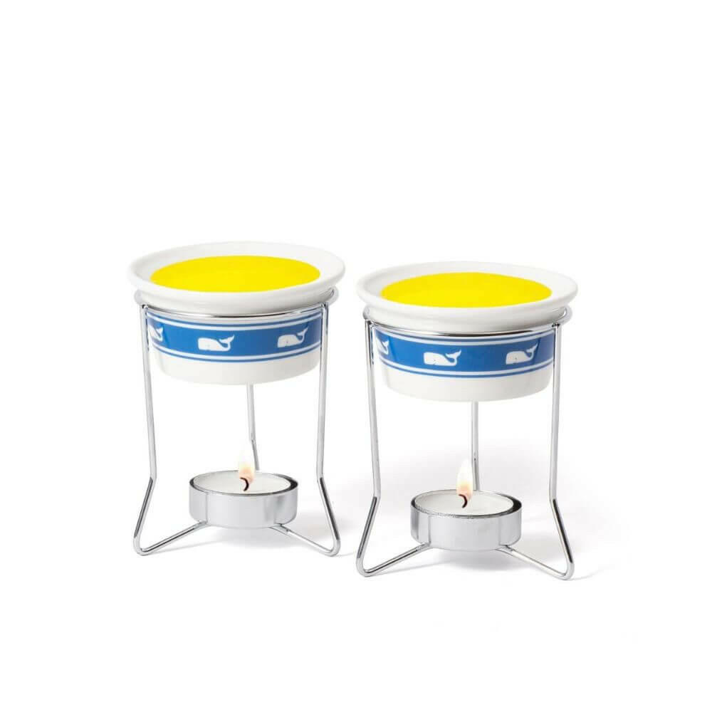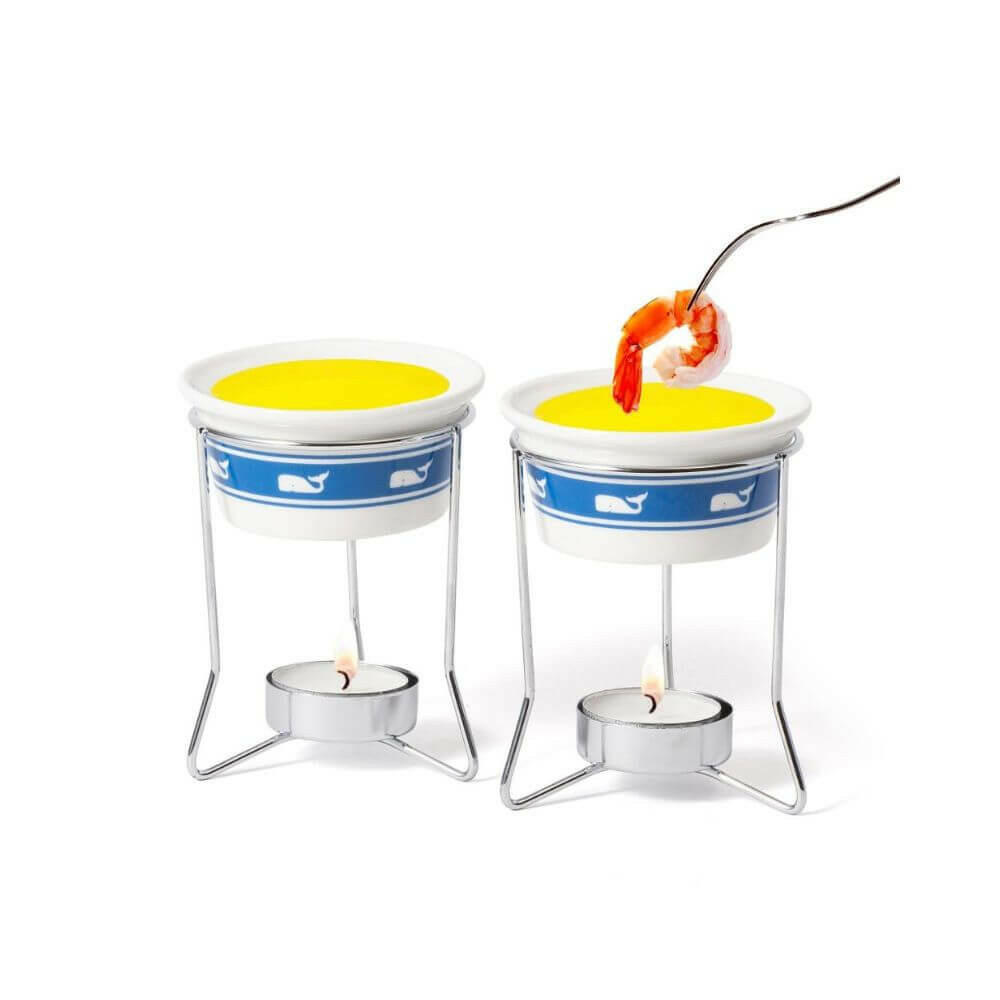 A nautical butter warmer for your seafood dinners and gatherings. This Whale Butter Warmer features ceramic cups that have a cheerful blue whale design on metal stands. You can keep your butter or sauces warm with the tea light candles that come with it.