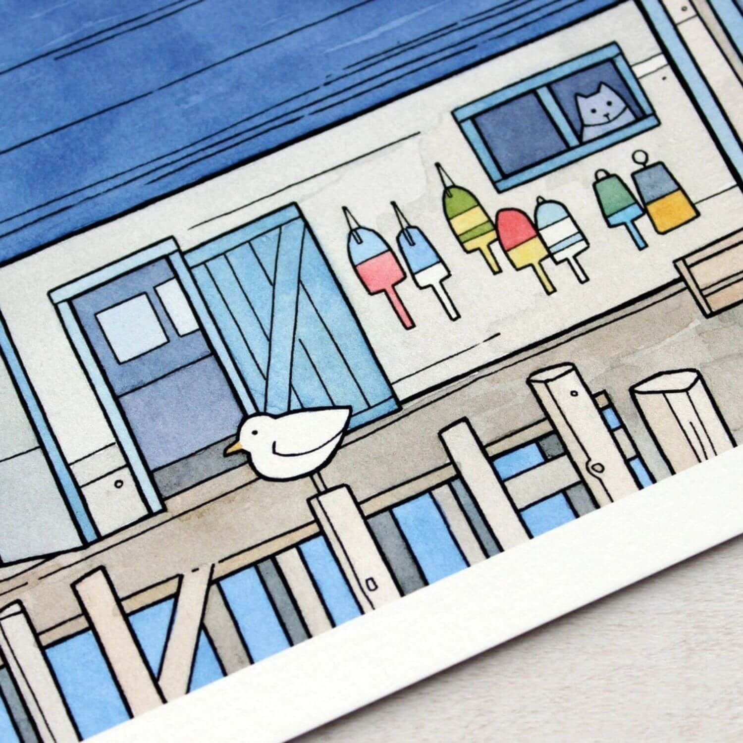 Bring the charm of coastal New England into your home with this lobster dock art print. This features whimsical details like seagulls, colorful lobster buoys hang on the side of a fishing building, and a curious cat peeking through the window. Drawn in a fun modern style with vibrant watercolor tones.