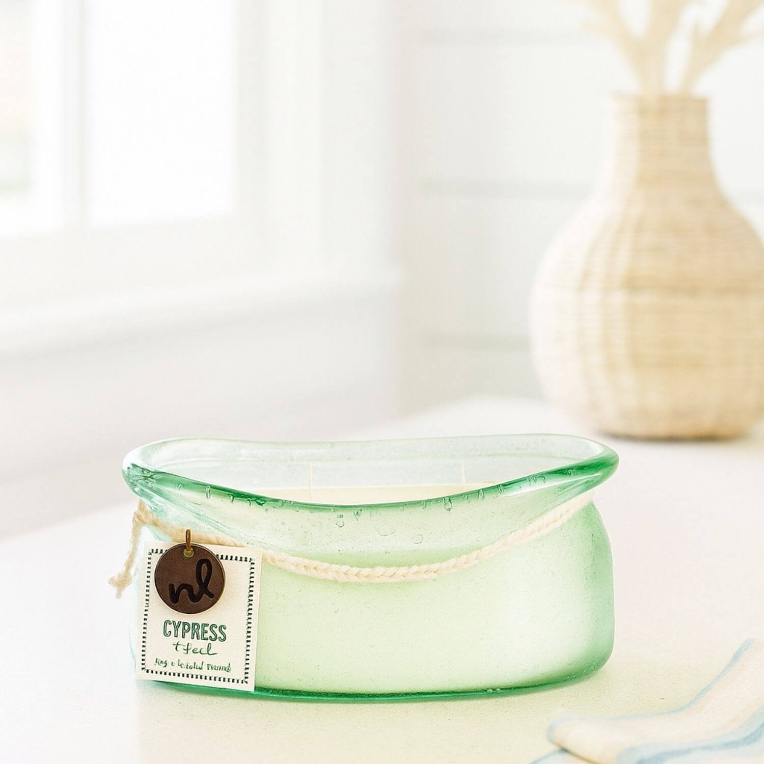 Each 7" x 3.5" candle is hand-poured into a one-of-a-kind, artisan-blown vessel. The soft sea-glass tint, gently rolled rim, and bubbles beneath the surface evoke the beauty of salt-kissed tides and sunlit coastal glass. No two vessels are alike, making every piece a lasting work of coastal artistry.