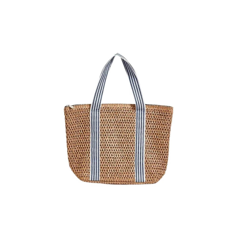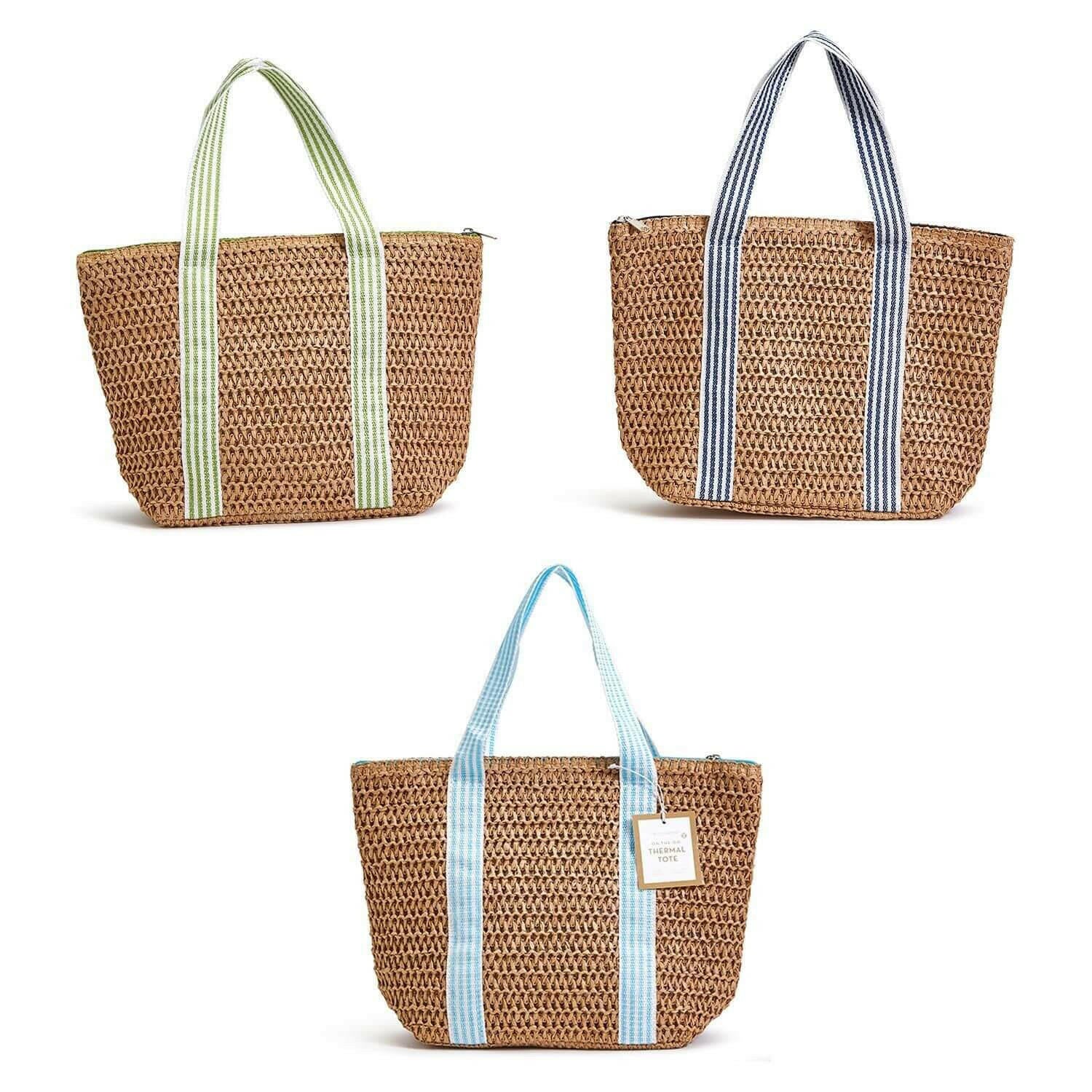Pack your lunch coastal-style. This lightweight paper raffia and nylon lunch tote has a thermal lining, zipper closure, and sturdy striped webbed handles. It's the perfect lunch tote bag to use for work, school, the beach, picnics, and for all your travels. Features striped handles in your choice of 3 colors.