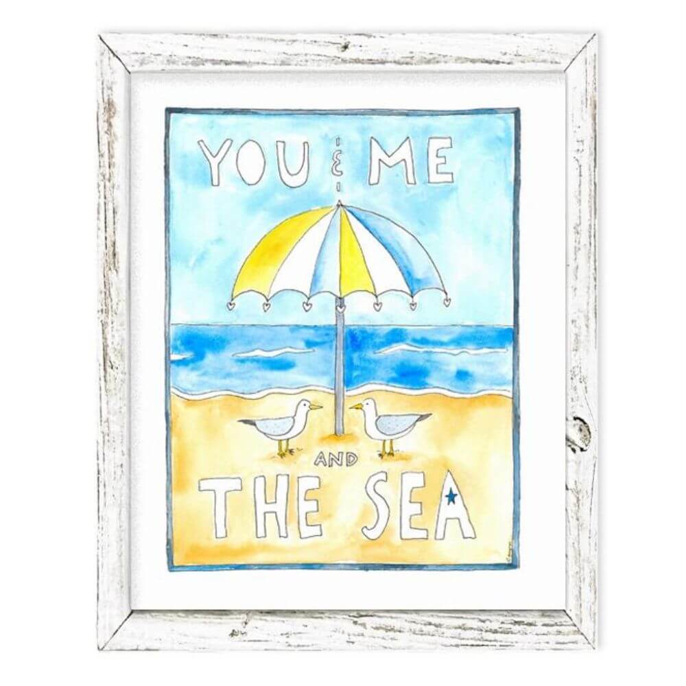 Transform your coastal-inspired space with the charming You & Me and the Sea Beach Art. Featuring soft blues, sandy yellows, and seagulls under a striped umbrella with "You & Me and the Sea" text, this artwork evokes the joy of seaside adventures and symbol of connection and tranquility for those who cherish the ocean.
